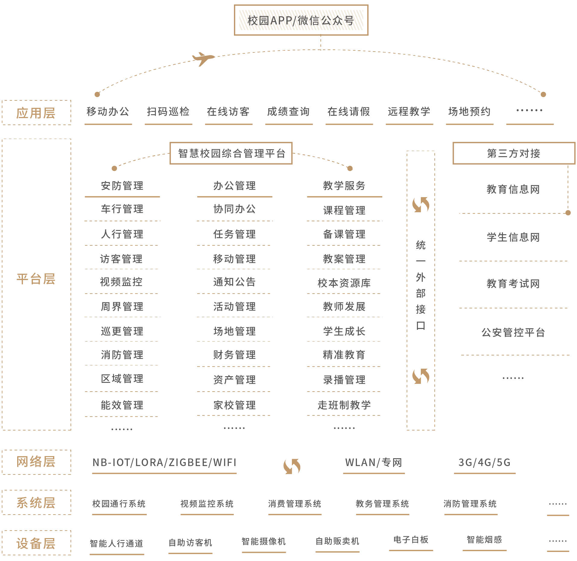 智慧校园mk体育在线官网(中国)融合“互联网+教育“思维,利用新一代物联网技术和智能感知设备构建集校园工作、学习和生活于一体的智慧教育生态系统。系统集人脸识别门禁、智能照明、环境监测、安防报警、视频监控、车牌识别、智慧路灯、智能巡更、电子围栏、智慧课堂等多类应用于一体,全面实现校园生活便捷化、校园管理智能化、课堂教学互动化、家校沟通无缝化,促进资源利用最大化,实现教育均衡发展。