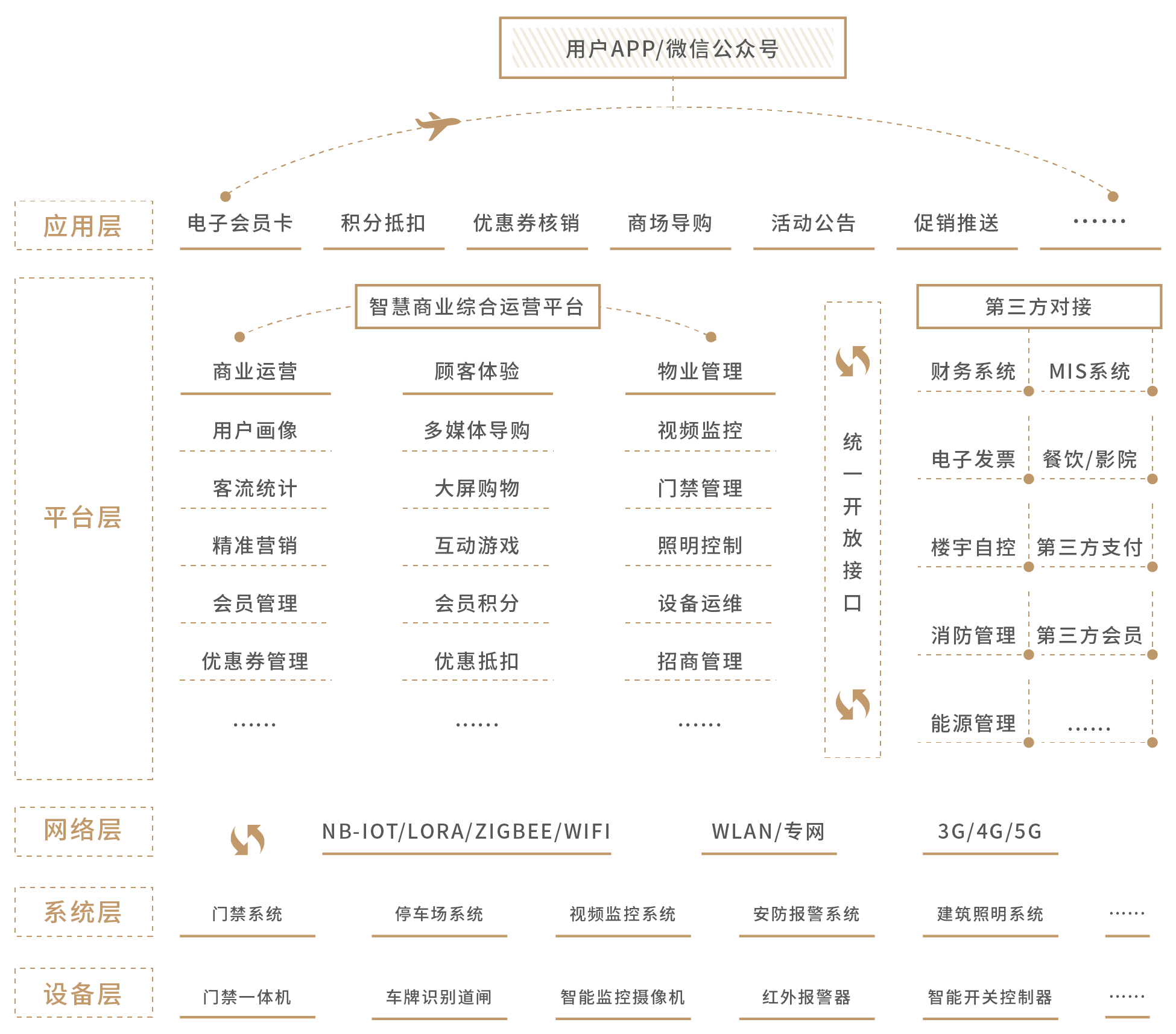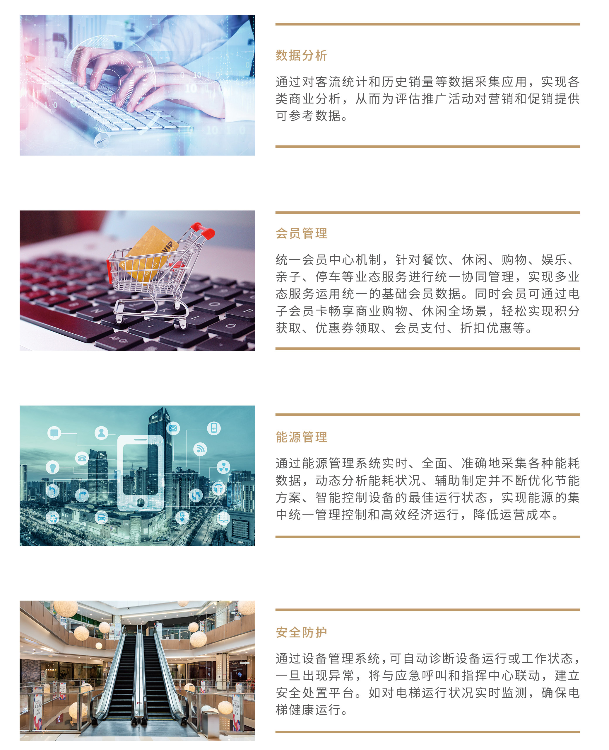 智慧商业mk体育在线官网(中国)是针对目前商业综合体面临的痛点,利用物联网思维,通过智能化设施的投入,构建一个强大网络架构,实现综合体内的所有业务承载,涵盖商业项目的招商、运营、营销、顾客体验及安全管理等,从而助力传统商业转型升级,实现商业资产保值、增值。